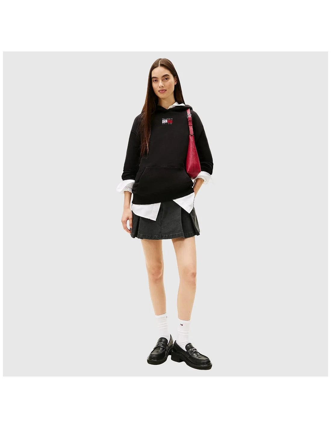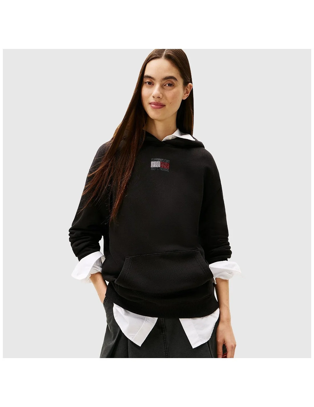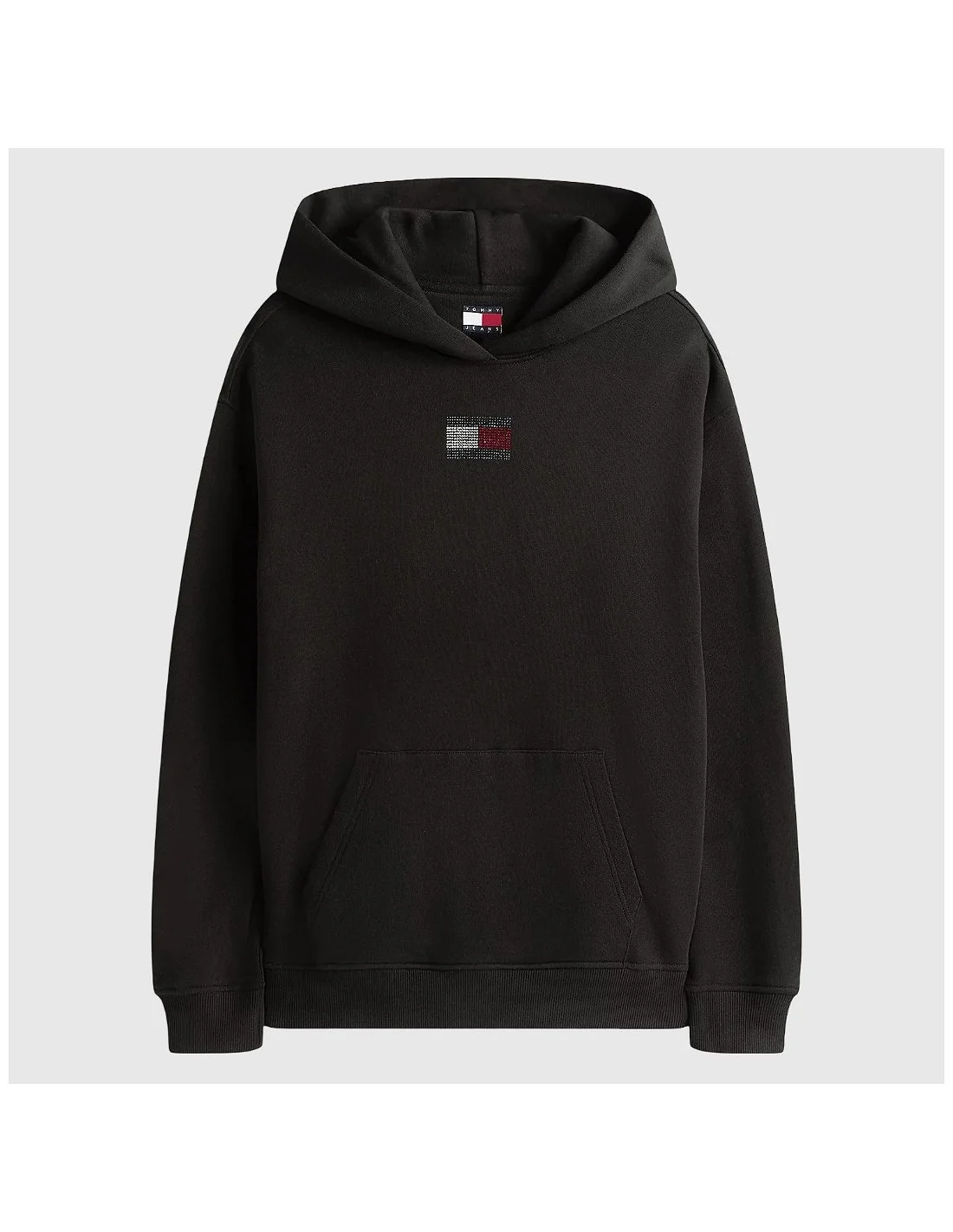 Sudadera con capucha de Tommy Hilfiger confeccionada en algodón suave. Presenta bolsillo tipo canguro, puños y bajo de canalé, además del logotipo icónico bordado en el pecho con acabado de microcristales. Su diseño cómodo y versátil la convierte en una prenda ideal para looks casuales con un toque moderno.