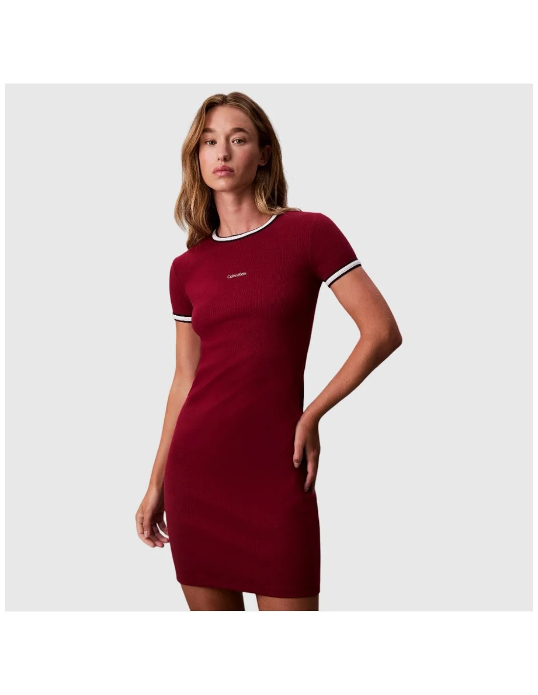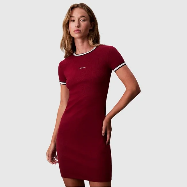 Vestido Calvin Klein de estilo ajustado con diseño tipo camiseta. Confeccionado en punto elástico de canalé, presenta cuello redondo y mangas cortas con ribetes en contraste. Incluye el logo de la marca bordado en el pecho, aportando un toque minimalista y distintivo. Ideal para un look casual con un aire deportivo.
