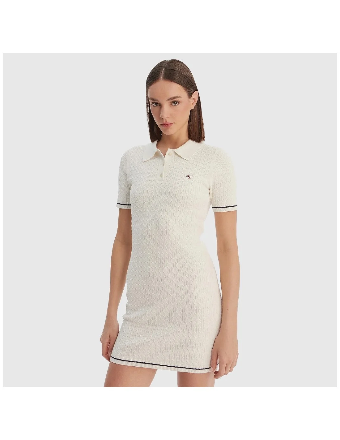 Vestido tipo polo Calvin Klein confeccionado en tejido de punto con textura trenzada que aporta un acabado sofisticado y favorecedor. Presenta cuello clásico con tapeta de botones y manga corta. Diseño ajustado que realza la silueta, con detalles en contraste en mangas y bajo, además de logotipo bordado en el pecho. Una prenda versátil ideal para looks casuales con un toque elegante.
