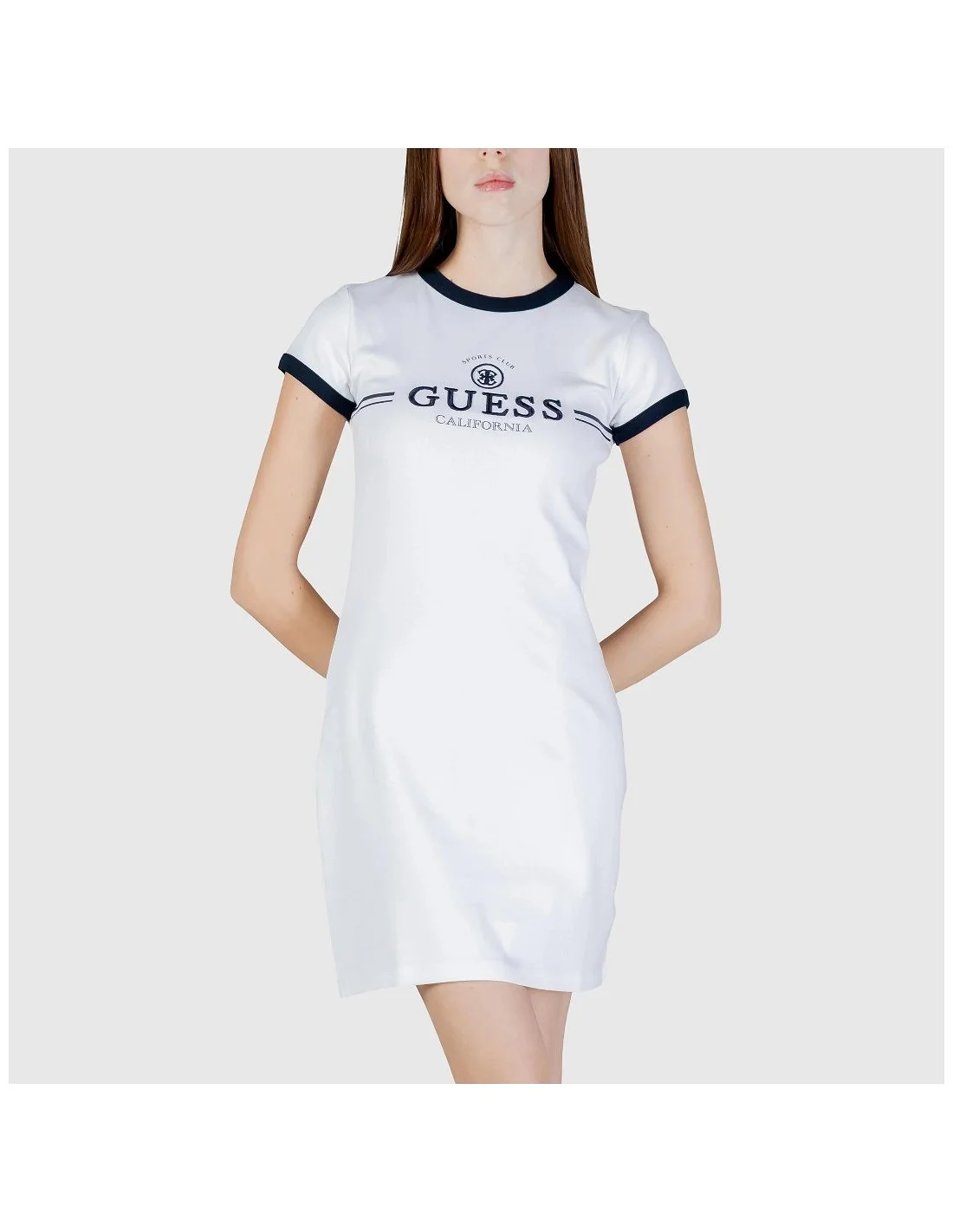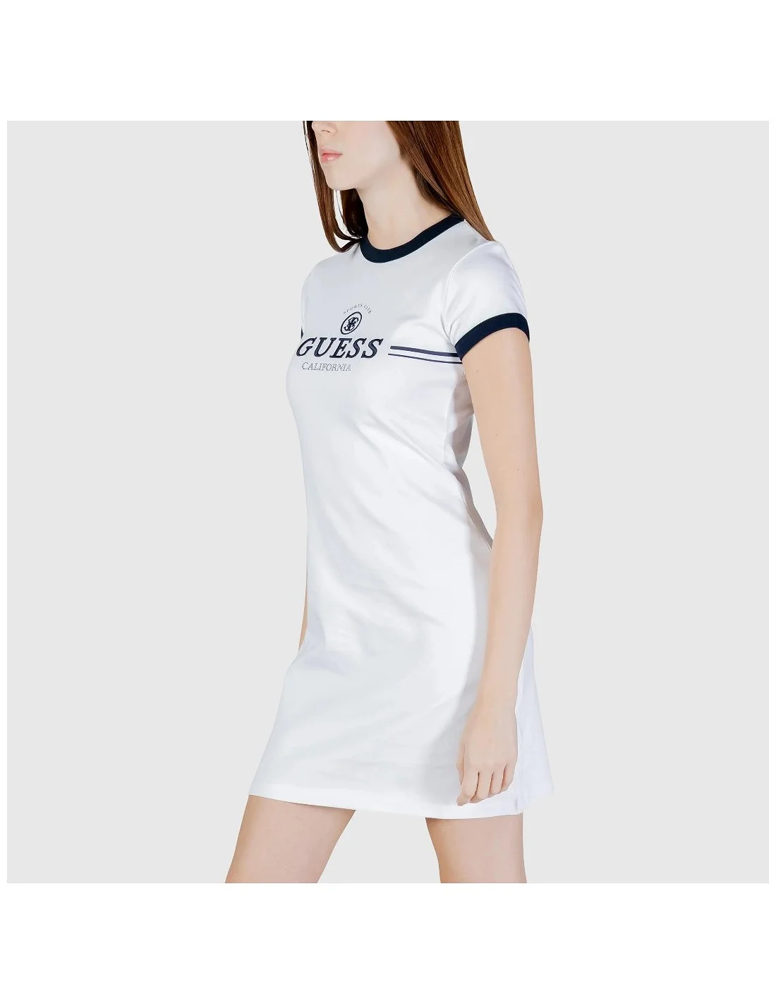 Vestido Guess de estilo camisero y silueta ajustada, con manga corta y cuello redondo ribeteado en contraste. Incorpora logotipo y texto estampados en el pecho con inspiración deportiva. Diseño cómodo y femenino, ideal para un look casual con un toque moderno.