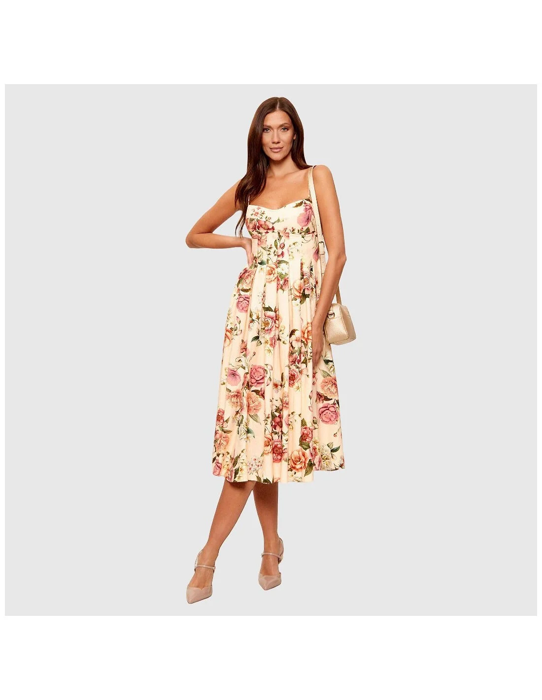 El vestido Guess es una prenda midi con tirantes finos y escote corazón, ideal para un look femenino y veraniego. Confeccionado en tejido ligero de tono crema con estampado floral en rosa y verde, ofrece un ajuste ceñido en el busto y falda con vuelo que aporta movimiento. El fruncido en la espalda mejora la comodidad y realza la silueta. Perfecto para eventos de día o salidas especiales.