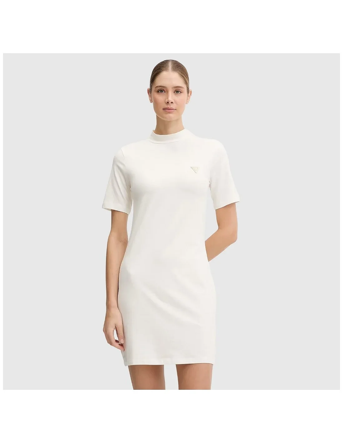 El vestido corto Guess para mujer presenta un diseño minimalista con cuello subido y mangas cortas. Confeccionado en tejido elástico de algodón, ofrece un ajuste ceñido que realza la silueta. El discreto logotipo metálico en el pecho aporta un detalle distintivo. Ideal para un look casual con un toque elegante.