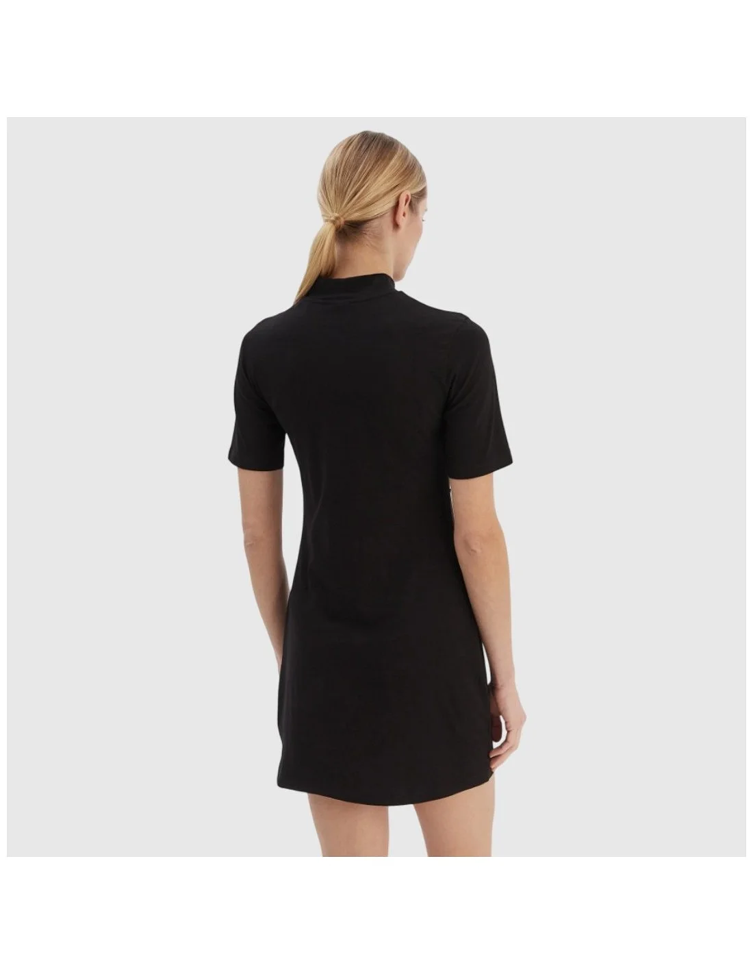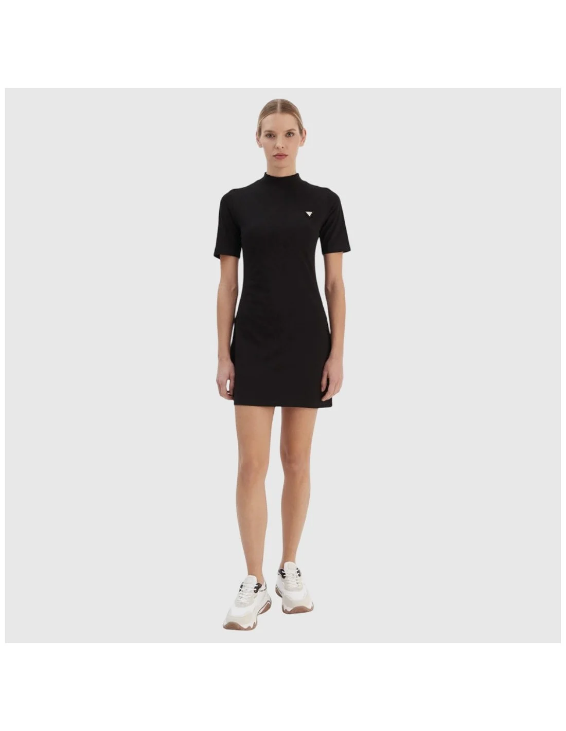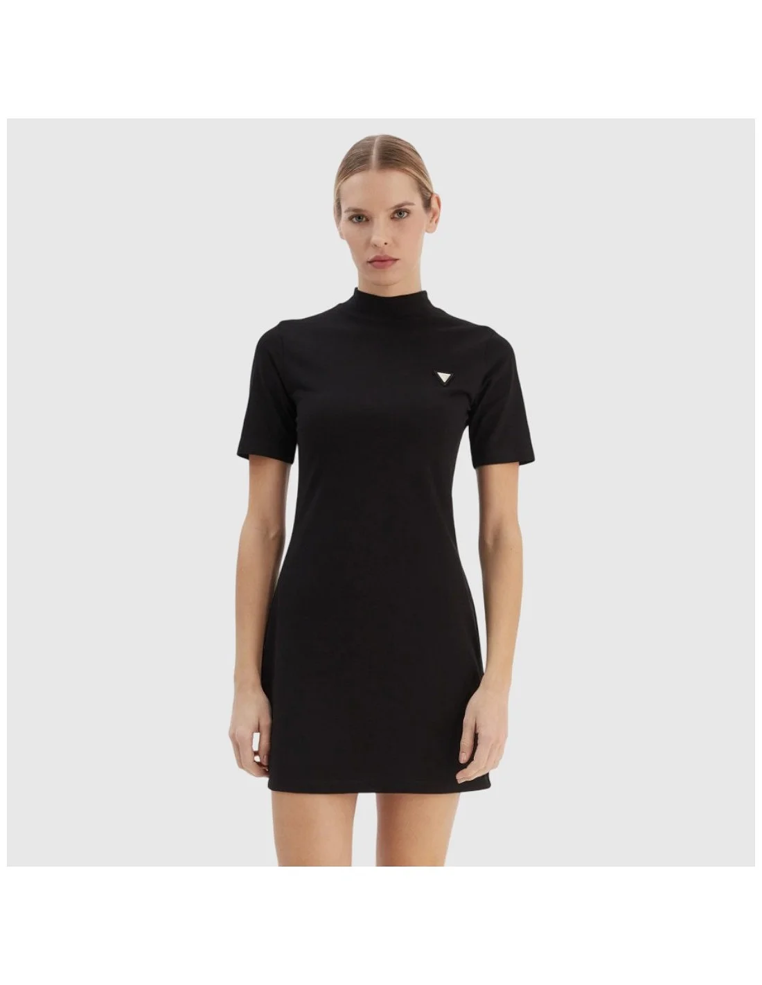 El vestido corto Guess para mujer presenta un diseño minimalista con cuello subido y mangas cortas. Confeccionado en tejido elástico de algodón, ofrece un ajuste ceñido que realza la silueta. El discreto logotipo metálico en el pecho aporta un detalle distintivo. Ideal para un look casual con un toque elegante.