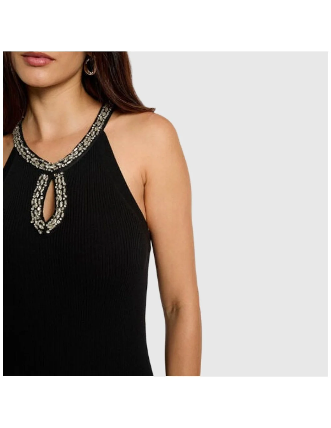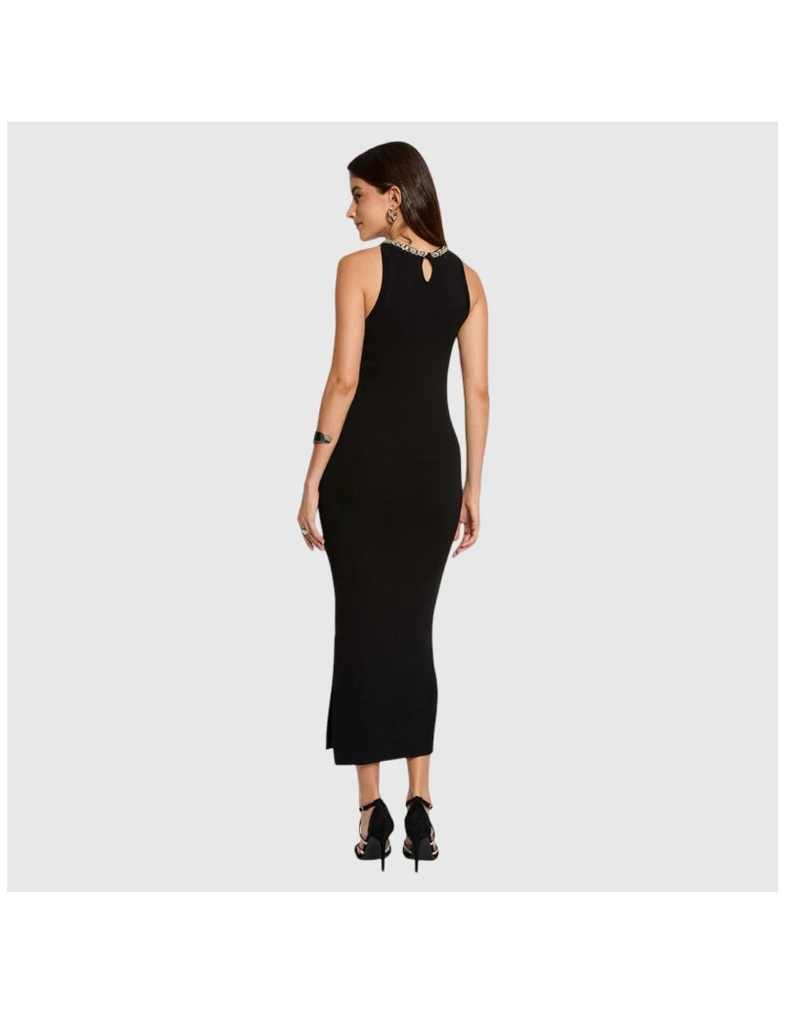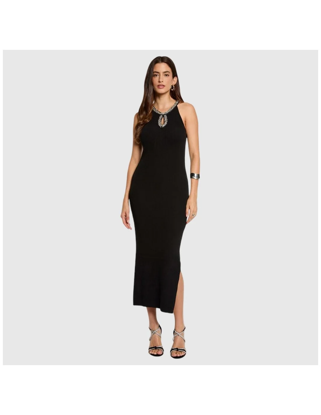 El vestido Morgan es una prenda elegante de corte midi, ideal para eventos formales o noches especiales. Confeccionado en tejido de punto, se ajusta al cuerpo con un fit entallado que realza la silueta. Su diseño negro incorpora un escote halter con aplicación de pedrería y abertura frontal, añadiendo un detalle sofisticado. La abertura lateral en el bajo aporta movimiento y estilo.