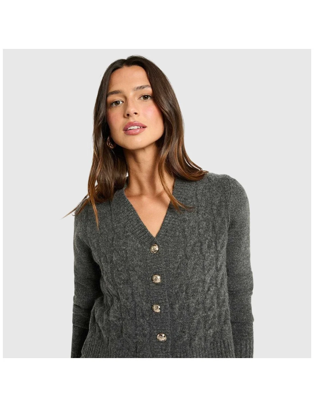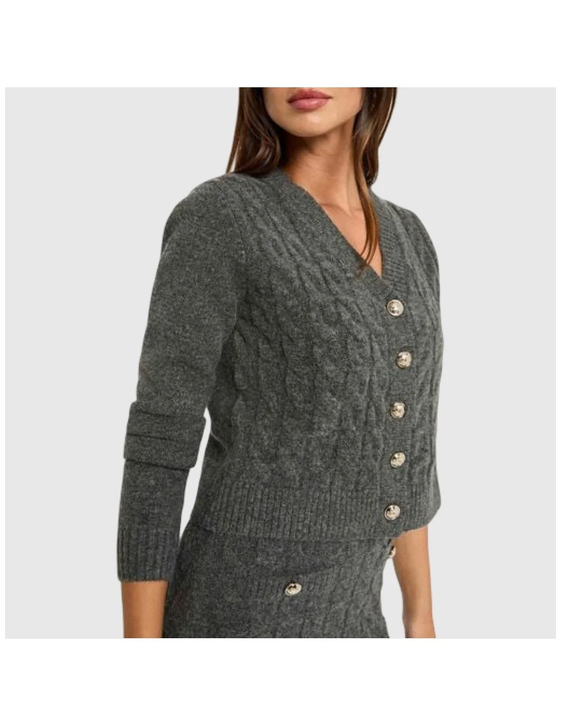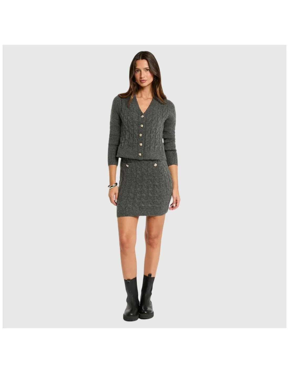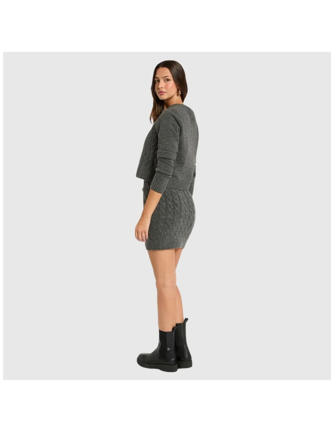 El vestido Morgan combina estilo y confort con un diseño de punto trenzado en tono gris oscuro. Presenta una silueta ajustada de corte mini y se acompaña de un cárdigan a juego con botones decorativos metálicos, ideal para looks casuales con un toque sofisticado. Confeccionado en tejido suave y cálido, es perfecto para los días frescos sin renunciar al estilo.
