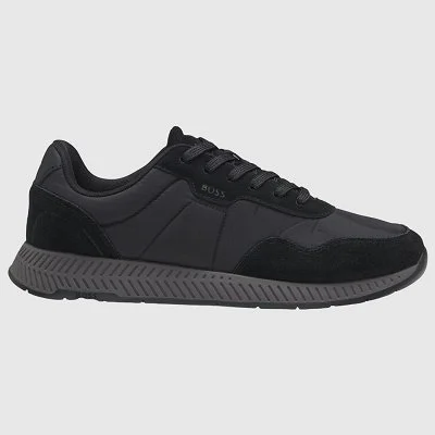 Zapatillas BOSS con diseño moderno y materiales mixtos que combinan malla, ante y detalles sintéticos. Incorporan una suela de goma con dibujo geométrico para mayor tracción y confort, así como un distintivo logo en el lateral y talón. Perfectas para un estilo casual con un toque sofisticado.