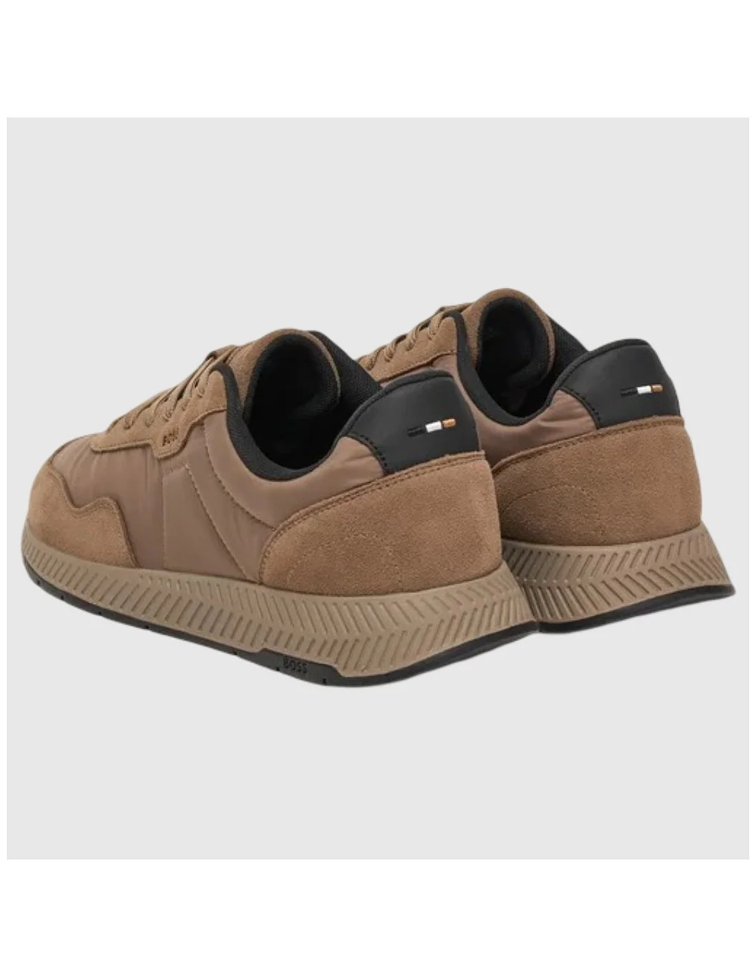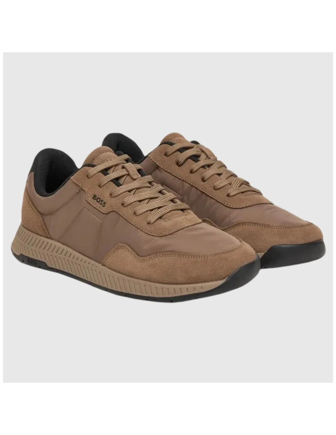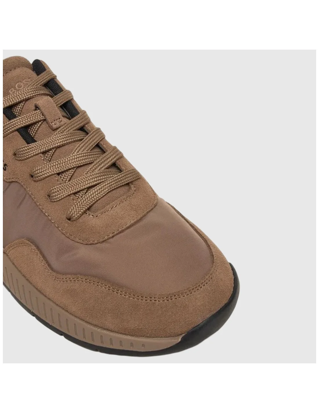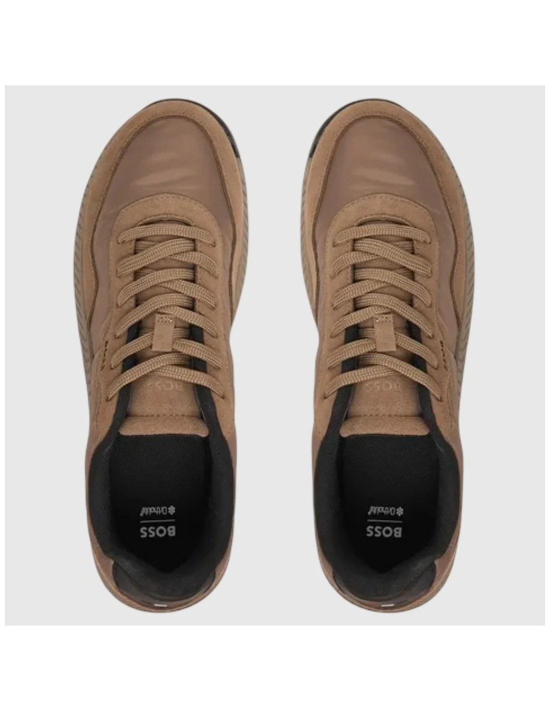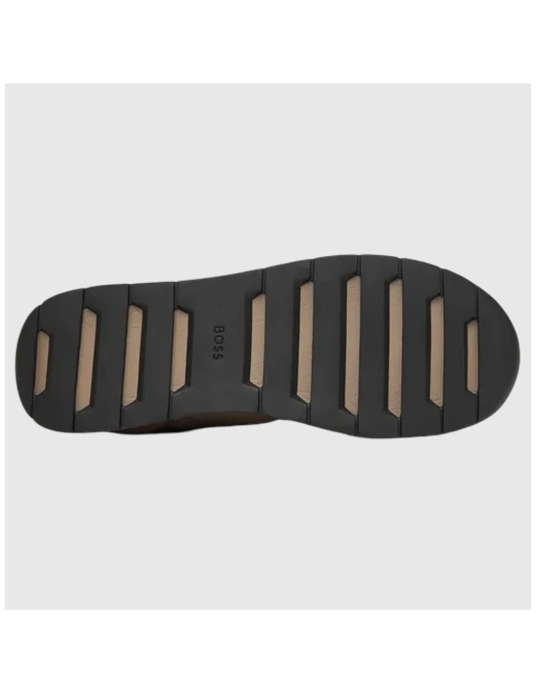 Zapatillas BOSS con diseño moderno y materiales mixtos que combinan malla, ante y detalles sintéticos. Incorporan una suela de goma con dibujo geométrico para mayor tracción y confort, así como un distintivo logo en el lateral y talón. Perfectas para un estilo casual con un toque sofisticado.