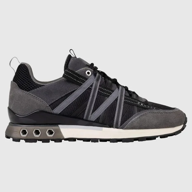 Las zapatillas Cruyff presentan un diseño técnico y moderno, ideal para el uso urbano o actividades al aire libre. Fabricadas con una combinación de malla, gamuza y detalles sintéticos, ofrecen comodidad y transpirabilidad. Su suela negra con patrón hexagonal proporciona excelente tracción, mientras que los tonos grises y negros aportan un estilo versátil y contemporáneo.