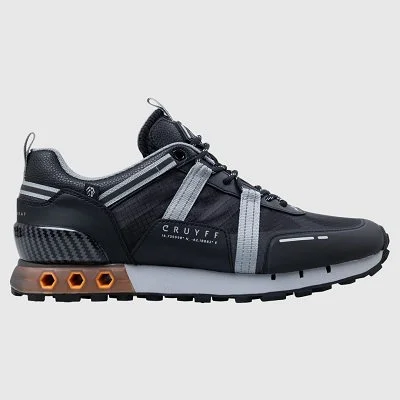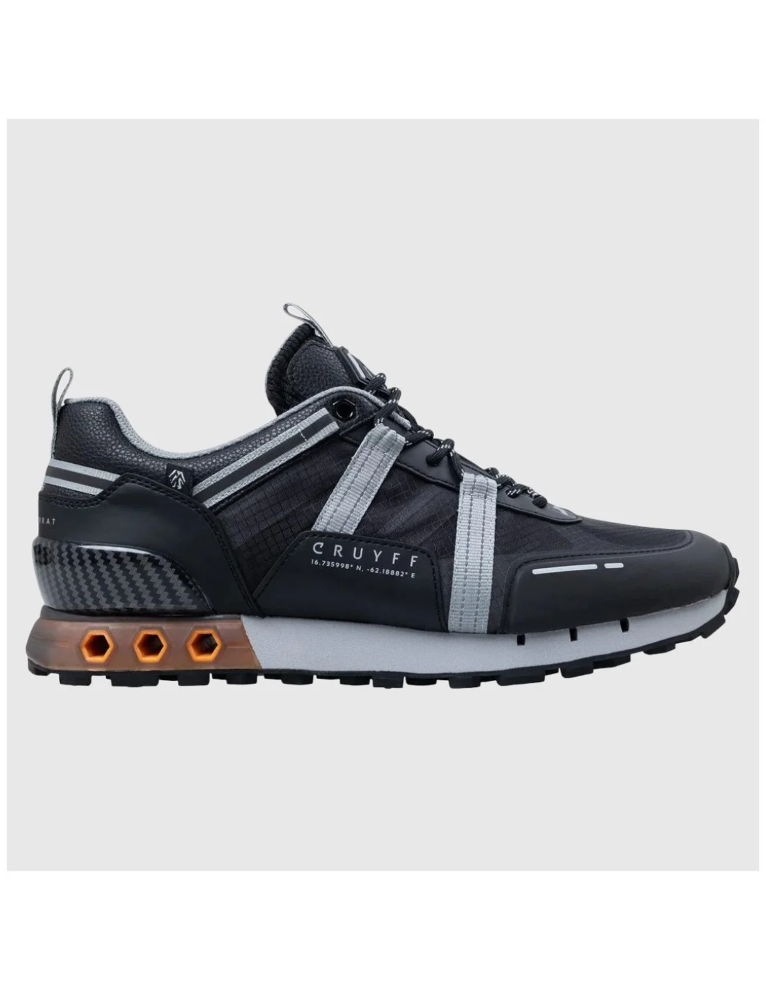 Zapatillas Cruyff de diseño técnico y estilo urbano, inspiradas en el trail running. Presentan paneles de malla con refuerzos sintéticos, cordones cruzados tipo hiking y detalles reflectantes. La suela robusta con amortiguación visible y tacos hexagonales ofrece tracción y confort superiores. Un modelo versátil para quienes buscan rendimiento con una estética moderna.