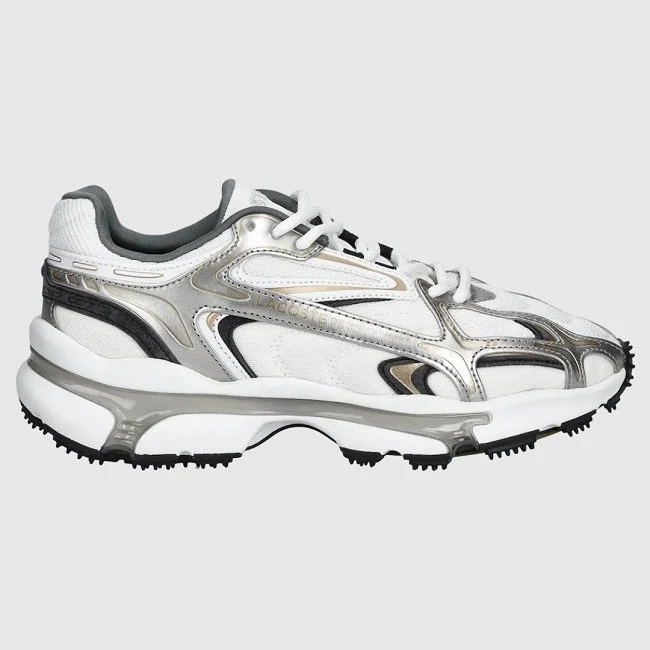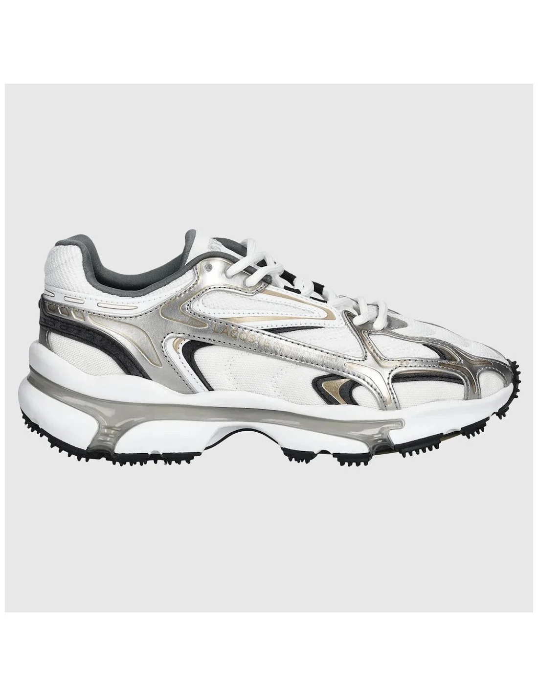 Las zapatillas Lacoste se destacan por su diseño futurista y funcional. Elaboradas en malla blanca con superposiciones sintéticas en tonos plateados y gris, ofrecen un ajuste cómodo y transpirable. La suela robusta con relieve proporciona tracción y estabilidad, ideal para un uso urbano activo. Detalles metálicos y branding sutil completan su estilo moderno.