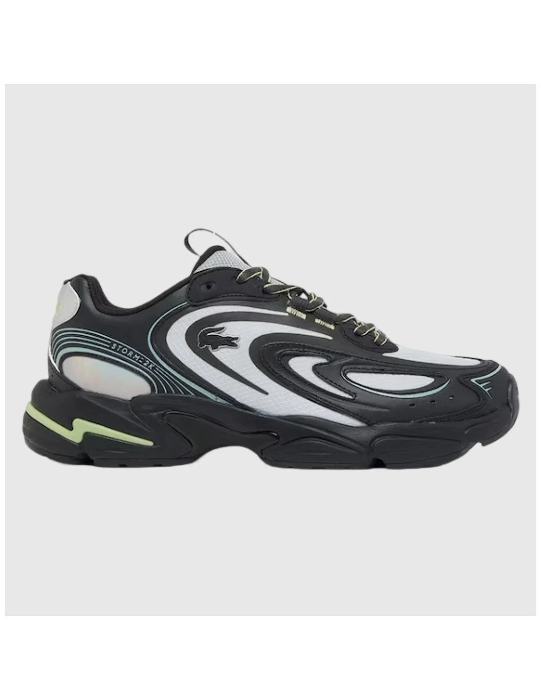 Zapatilla Lacoste de inspiración futurista con diseño dinámico y audaz. Presenta una construcción técnica con líneas curvas en contraste y detalles iridiscentes. Incorpora suela robusta de alto rendimiento y el nombre Storm 96 grabado en el lateral. Ideal para destacar en un look streetwear con estética deportiva retro-tech.