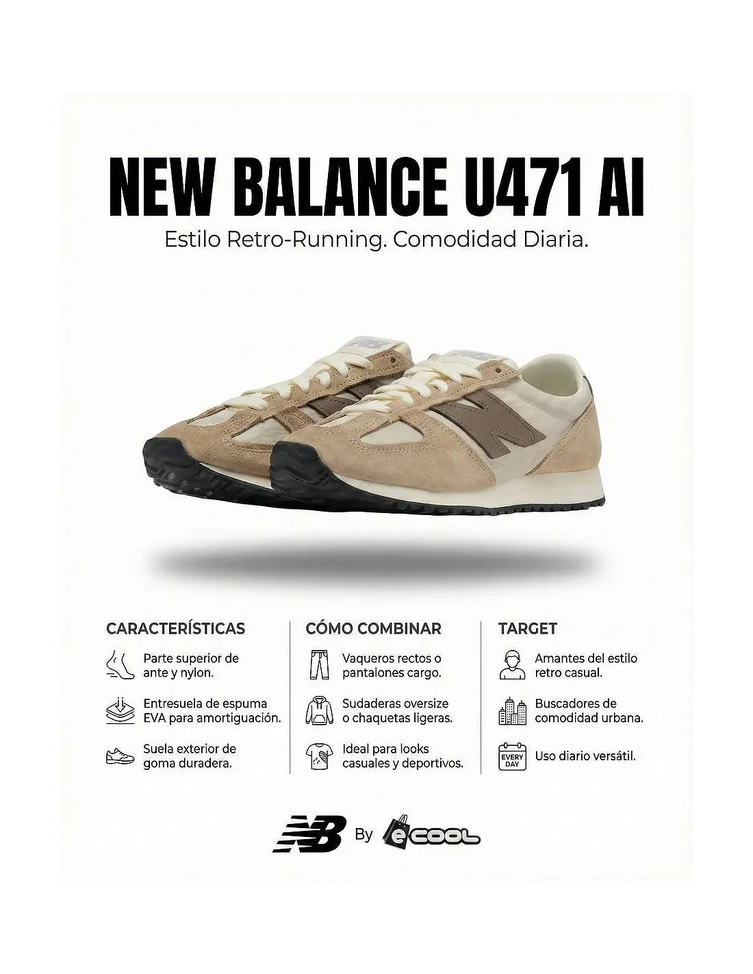 Las zapatillas New Balance U471 combinan estilo retro y funcionalidad para el día a día. Confeccionadas en una mezcla de ante y nailon, presentan un diseño clásico con suela de goma negra y el icónico logo N en el lateral. Su ajuste cómodo y su paleta neutra las hacen ideales para looks urbanos y casuales. Perfectas para un estilo relajado con identidad.