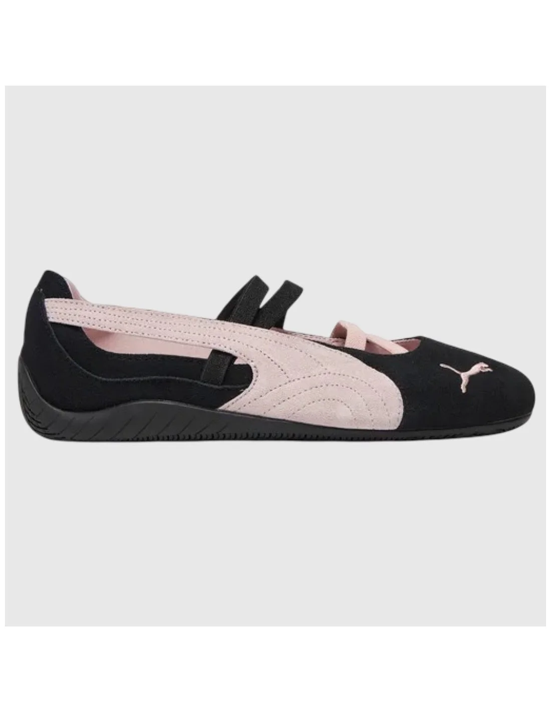 Bailarinas deportivas Puma confeccionadas en material tipo ante, con diseño de perfil bajo y puntera redondeada. Incorporan tiras elásticas cruzadas en el empeine para un ajuste cómodo y seguro, además del icónico Formstrip lateral y logotipo en la parte frontal y trasera. La suela flexible de goma proporciona ligereza y buena tracción, ideales para un estilo casual con inspiración deportiva.