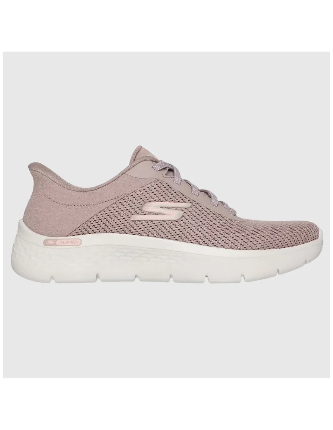 Tenis Skechers GO WALK FLEX en tono rosado suave, con diseño sin cordones que facilita un calce manos libres. Su parte superior de malla knit garantiza transpirabilidad, mientras que la suela con amortiguación flexible ofrece comodidad durante todo el día. Ideales para un estilo activo y moderno.